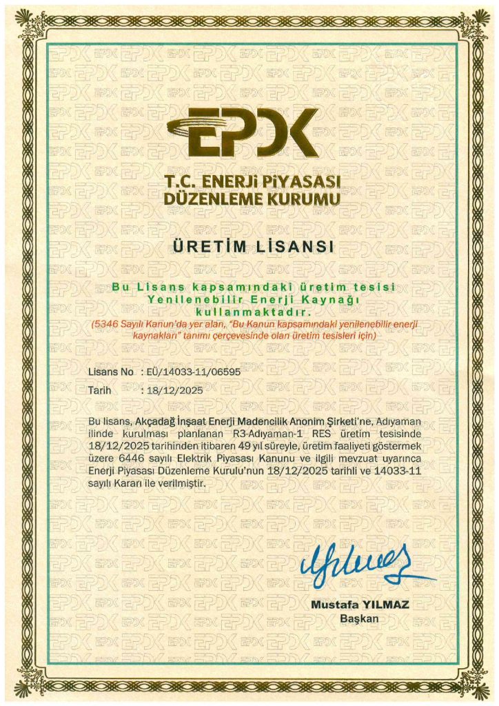 R3-Adıyaman-1 RES projemiz, ilgili tüm idari ve teknik süreçlerin tamamlanmasının ardından üretim lisansı almaya hak kazanmıştır.